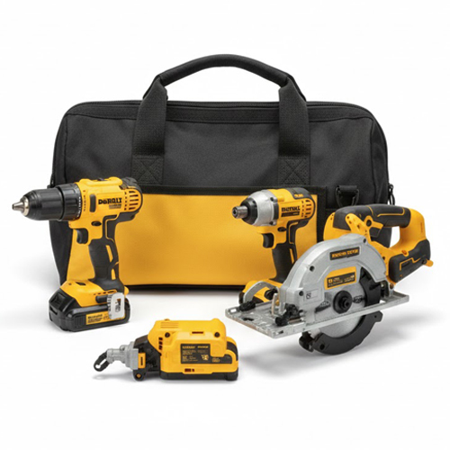 This image showcases a versatile combo kit of power tools, typically featuring essential items like drills, saws, and a battery. Such kits are designed to provide convenient and cost-effective solutions for various DIY projects and professional tasks. They often include a carrying bag for easy portability and organization of the tools.